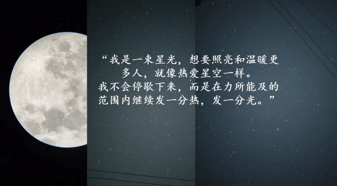 “我是一束星光,想要照亮和温暖更多人,就像热爱星空一样。我不会停歇下来,而是在力所能及的范围内继续发一分热,发一分光。”--李俊宏