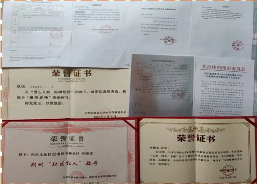 一路成长受到了学校、社会、国家的帮扶和关爱,所以李俊宏在校内外坚持参加各类公益活动,帮助有需要的人,回馈社会。他大学四年从校内的疫情防控志愿者、社会实践公益社社长做到了街头,做到了社区,累计志愿服务时长210余小时。先后加入武汉市无偿献血志愿者协会、荆州市红十字会、荆州市青年突击队成为志愿者。在2023—2024年荆州市春运暖冬行动中被共青团荆州市委员会评为“优秀志愿者”;2024年3月,被荆州市委常委、中共荆州市委文明办授予荆州“社区红人”称号。