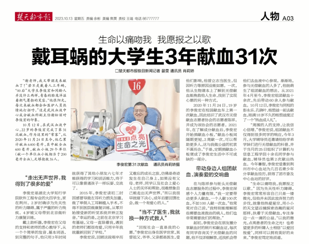 李俊宏入校以来积极参与无偿献血,多次参加寒暑期应急献血和志愿活动,为拯救生命,保障血液安全贡献了一份力量。并带动身边的人一起了解和参与到无偿献血活动中。