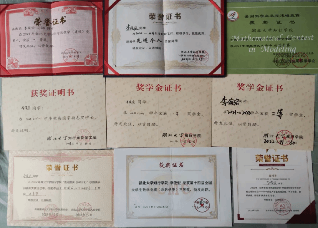 李俊宏保持了优异的学业成绩,在校内获得院级“先进个人”荣誉称号,通过CET4考试,先后获得校级一等奖学金、三等奖学金、国家励志奖学金。并多次参加学科竞赛,获得校级数学建模比赛一等奖并代表学校本科队参加省赛,在全国大学生数学竞赛获得三等奖。参加大学生创新创业比赛,在教育部“宏志助航”计划全国高校毕业生就业能力培训项目中获得华中师范大学授予的“优秀学员”荣誉证书。